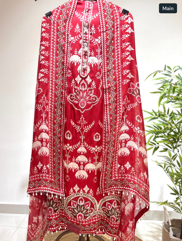 Chanderi Silk Suit With Silver Lined Grace(Red)