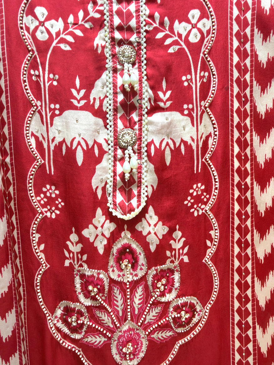 Bottom: Matching fabric in plain red shade for tailored pants, palazzos, or farshi salwar