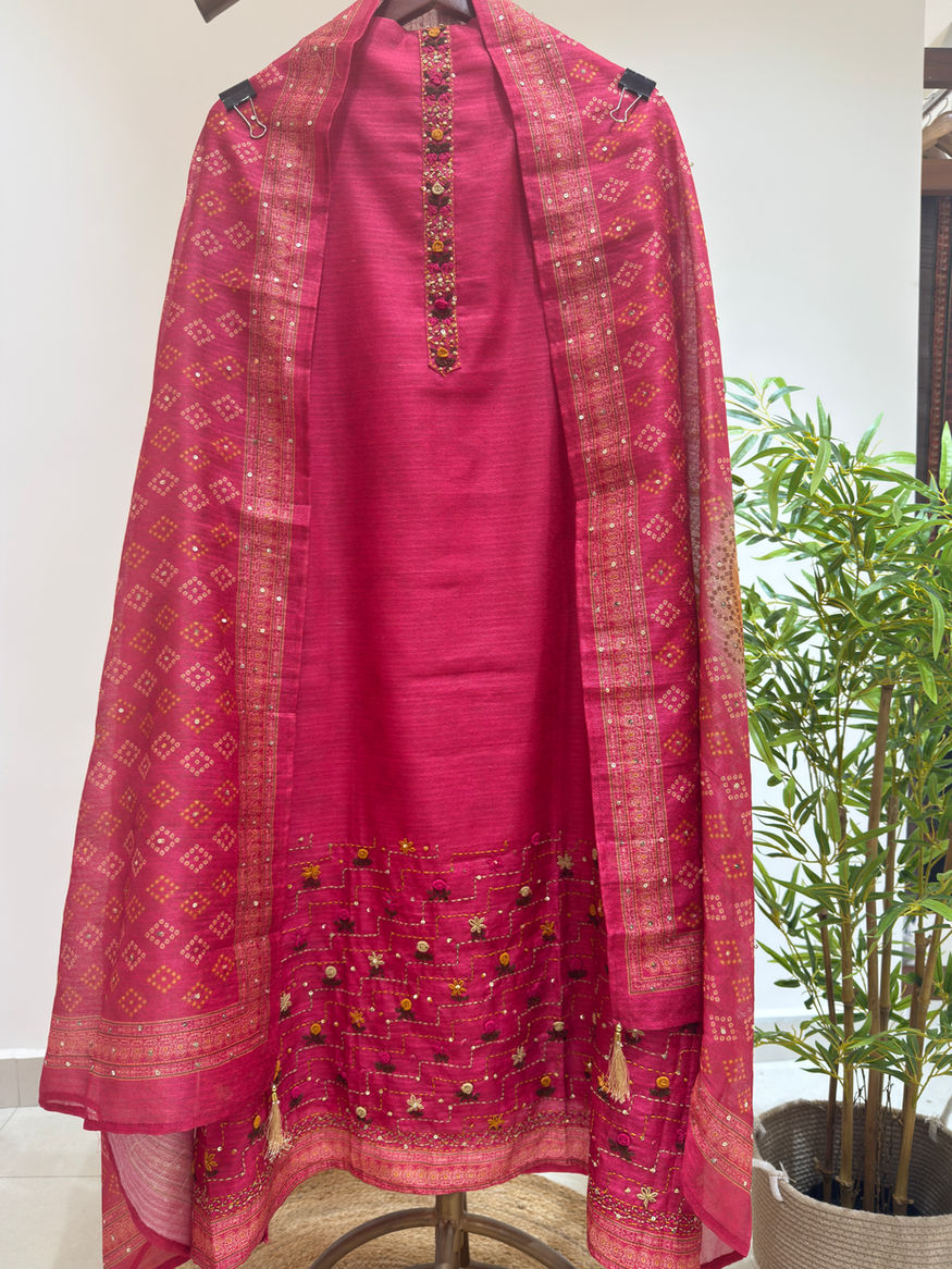 Step into festive elegance with this Premium Tussar Silk Suit featuring delicate katha and embroidery work that adds charm and sophistication.