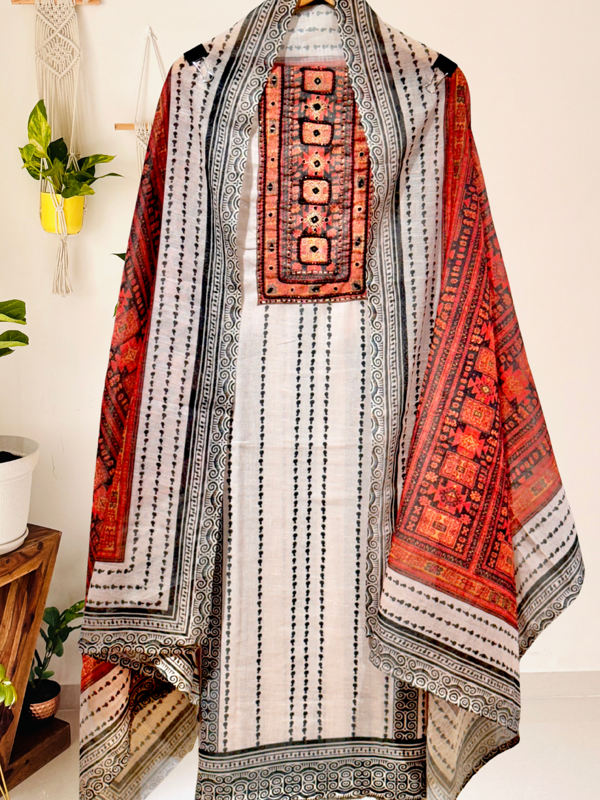 This linen suit blends heritage patterns with contemporary elegance. The ivory base, adorned with vertical line motifs, lends a refined silhouette, while the deep rust and black Kutch-inspired borders exude cultural richness. The neckline is accentuated with delicate black bead work, adding just the right touch of sparkle to the earthy design.